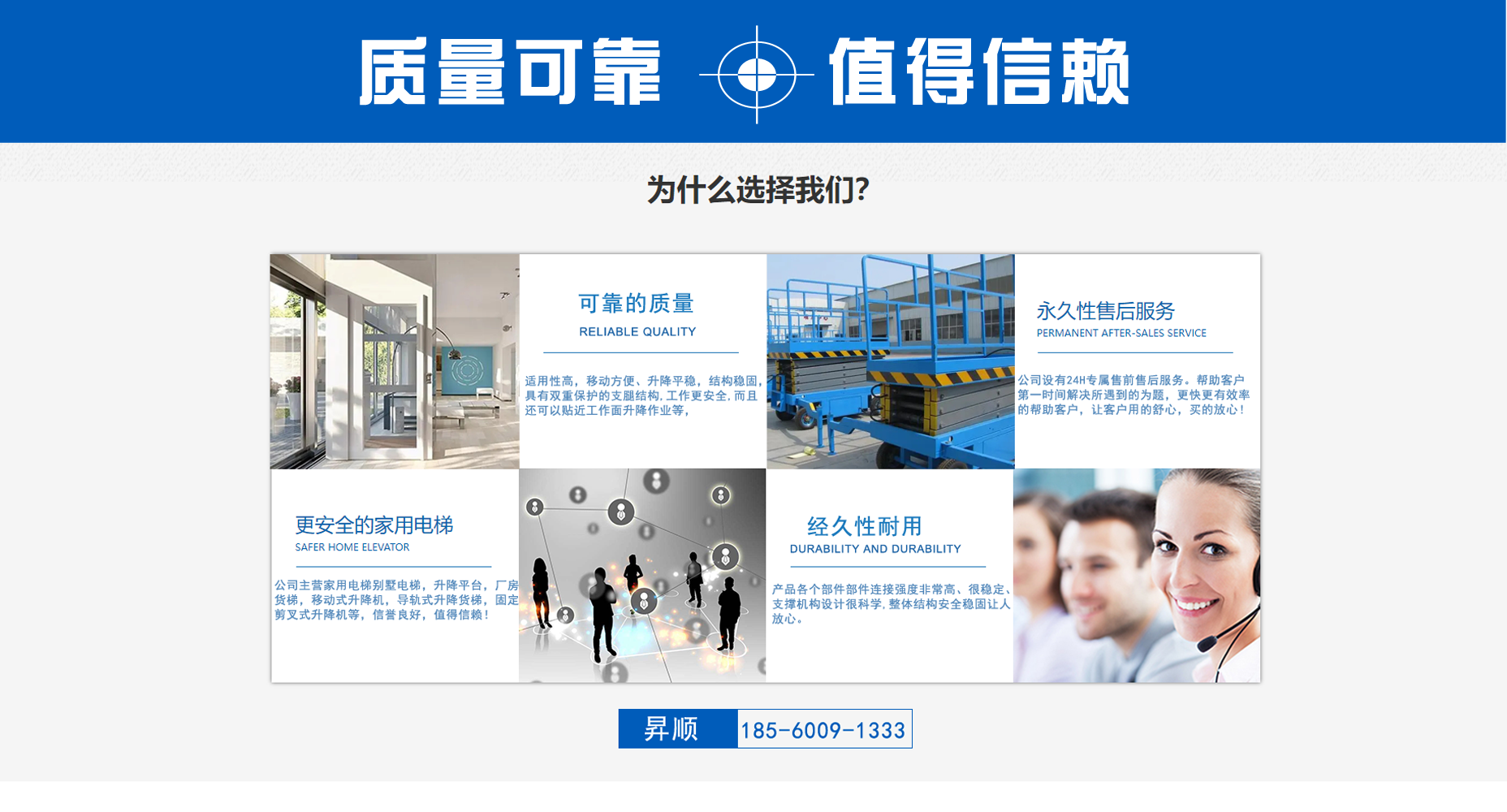 山東昇順液壓升降機械有限公司是一家主營家用電梯,別墅電梯,升降平臺,廠房貨梯,移動式升降機,導軌式升降貨梯,固定剪叉式升降機等產品企業,質量可靠,值得信賴?! ∮脩糁辽?,以用戶為中心”是公司永遠堅持的服務宗旨,贏得用戶的贊許是我們的榮譽,及時滿足用戶的需求,是我們公司的愿望。長期以來,公司員工以優質的服務,取悅于用戶,以誠信的言行取信于用戶,得到了用戶們的好評。我們期待著與您更加愉快的合作!公司的發展,離不開社會的大力支持,在社會的支持和幫助下,我們正昂首闊步邁向未來! 我們的經營方針是:以質量求生存,以產品求發展,以信譽保合作,以服務贏客戶?! ”竟緦Ξa品質量和各項服務恪守合同承諾,并愿與新老客戶精誠合作,共創未來。 公司精神:創新是主題,超越是不懈的追求。 公司宗旨:信譽保證,誠信為本?! ∥覀儠院侠淼膬r格,良好的信譽,雄厚的實力,優質的產品,最周到的服務,服務于廣大新老客戶!...